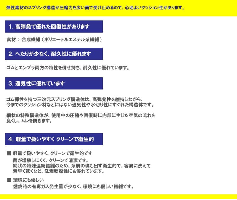 - RSR体圧分散マットは適度な沈み込みで体型を保持するので、体圧が分散されて快適な寝心地を得ることができます。床つき感がありません。